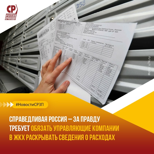 Председатель Партии СПРАВЕДЛИВАЯ РОССИЯ – ЗА ПРАВДУ, руководитель партийной фракции в Госдуме Сергей Миронов направил обращение главе Минстроя РФ Иреку Файзуллину с предложением обязать управляющие компании указывать в платёжках информацию о расходовании средств граждан, которые они перечисляют в счёт оплаты коммунальных услуг. Соавтором письма выступила председатель Комитета по развитию гражданского общества, вопросам общественных и религиозных объединений Яна Лантратова.