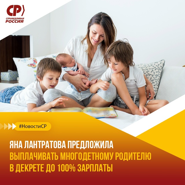 Председатель Комитета Госдумы по развитию гражданского общества, вопросам общественных и религиозных объединений, первый заместитель руководителя фракции СПРАВЕДЛИВАЯ РОССИЯ Яна Лантратова направила письмо Министру труда и социальной защиты РФ Антону Котякову с предложением внедрить прогрессивную систему оплачиваемого отпуска по уходу за ребенком для третьего и последующих детей, с выплатой 80-100% среднего заработка в зависимости от очередности рождения и возраста ребенка.