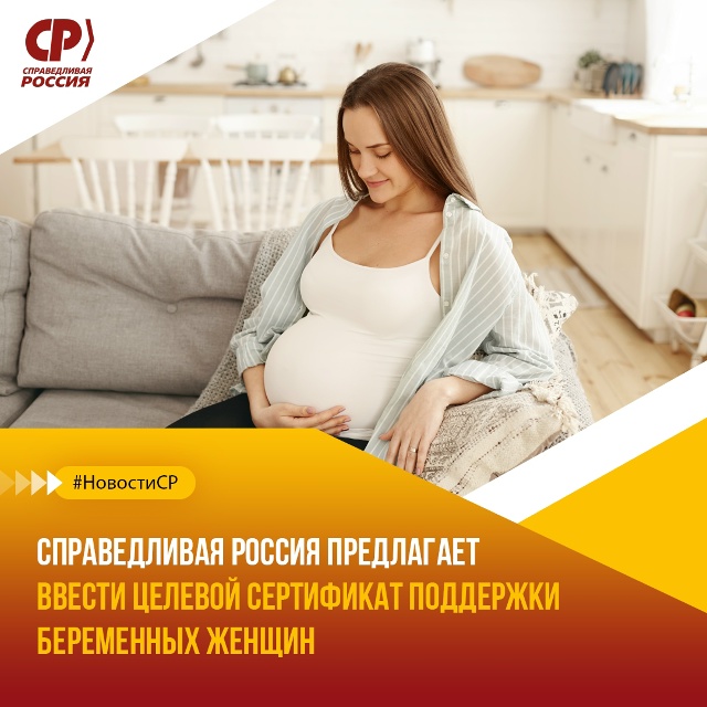 Председатель Партии СПРАВЕДЛИВАЯ РОССИЯ, руководитель партийной фракции в Госдуме Сергей Миронов направил официальное обращение Заместителю Председателя Правительства РФ Татьяне Голиковой с предложением ввести сертификат для поддержки беременных женщин. Соавтором инициативы выступила председатель Комитета Госдумы по развитию гражданского общества, вопросам общественных и религиозных объединений, первый заместитель руководителя фракции СР Яна Лантратова.