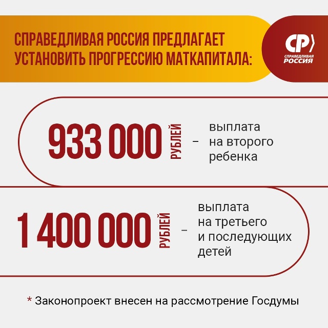 Председатель Партии СПРАВЕДЛИВАЯ РОССИЯ, руководитель партийной фракции в Госдуме Сергей Миронов внес в ГД законопроект о прогрессивной шкале маткапитала: на вторых детей выплаты предлагается увеличить до 933 тысяч рублей, на третьих и последующих – выплачивать 1,4 млн рублей.
